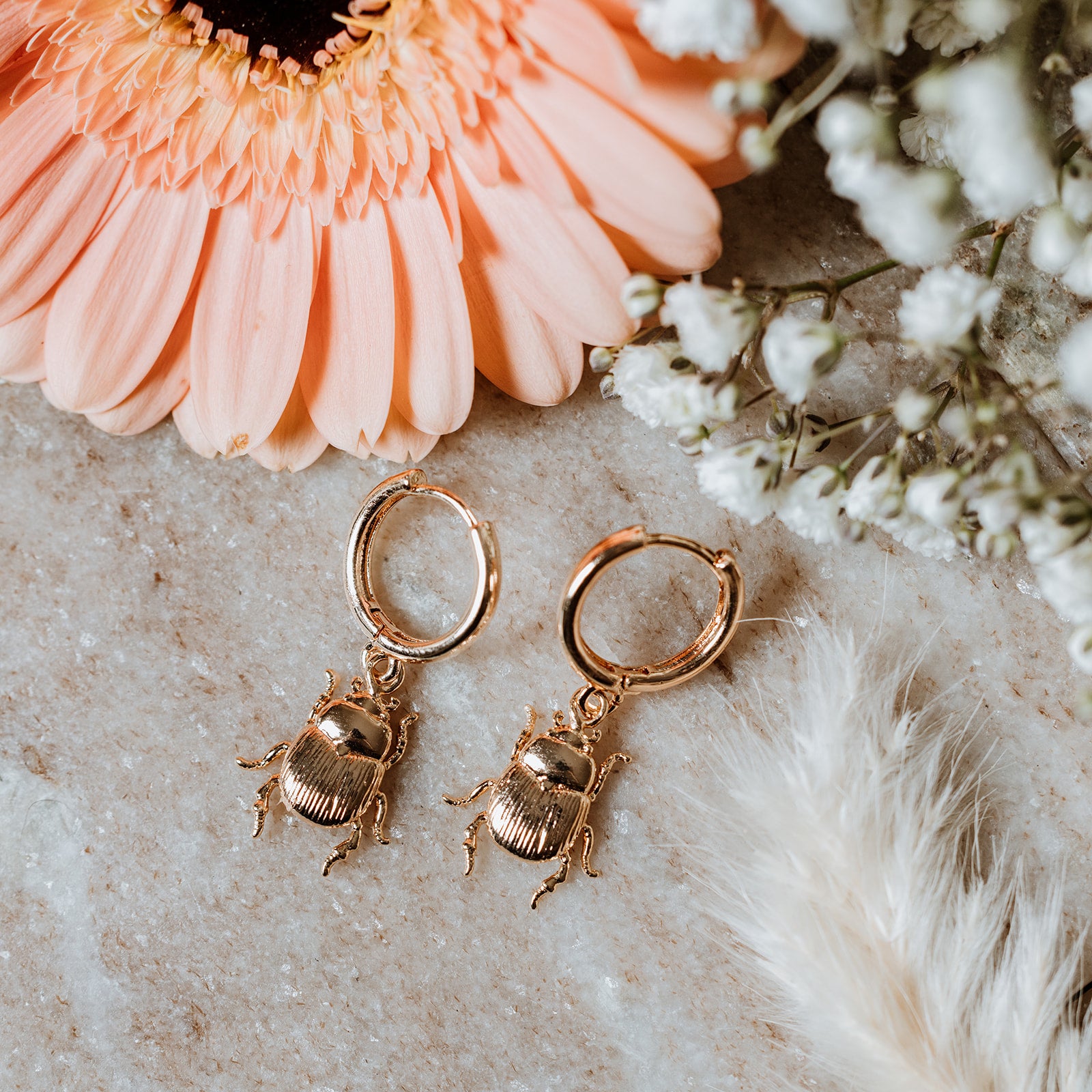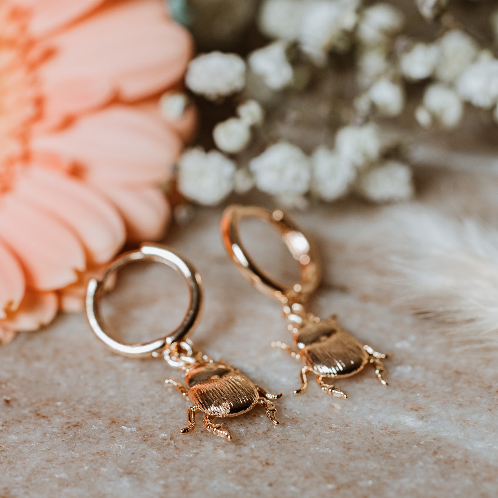 Gold huggies with a detailed beetle charm—nature-inspired, bold, and effortlessly stylish.