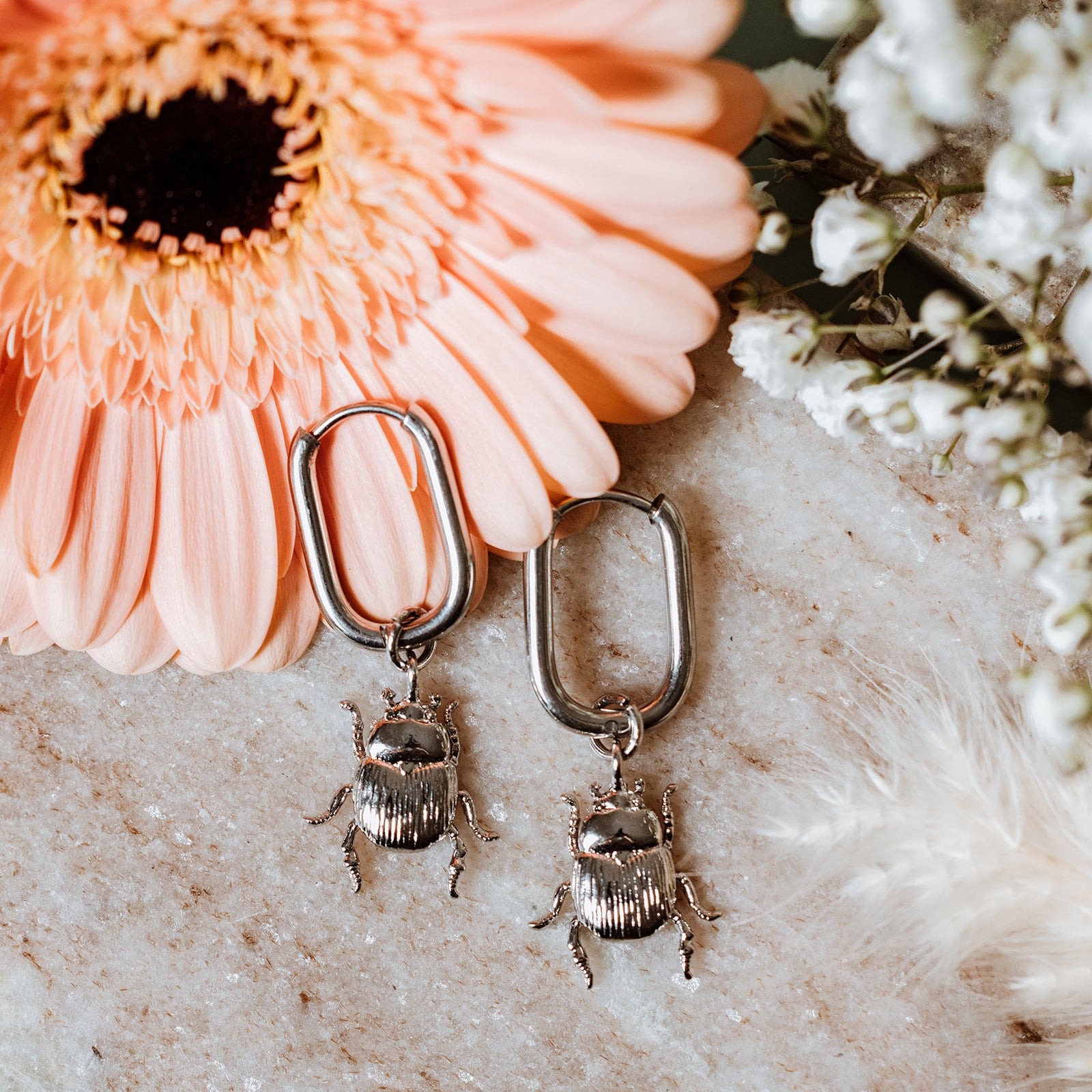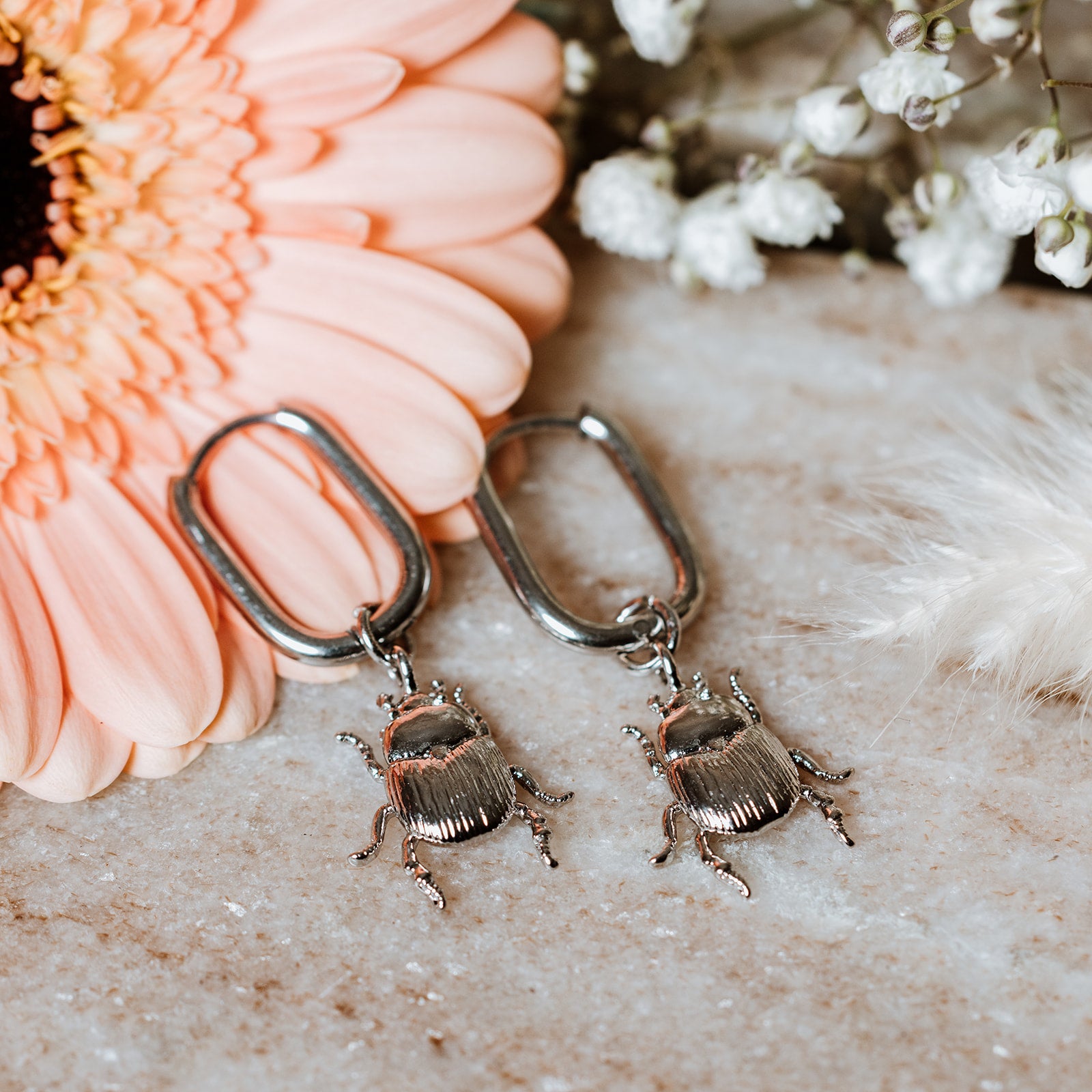 Sleek oblong hoops with a beetle-inspired shape—platinum perfection for a bold, modern look.