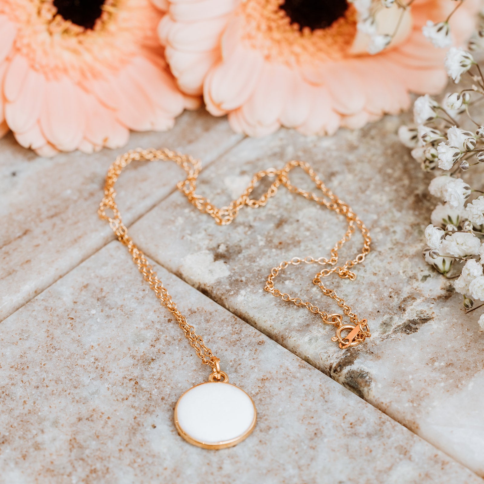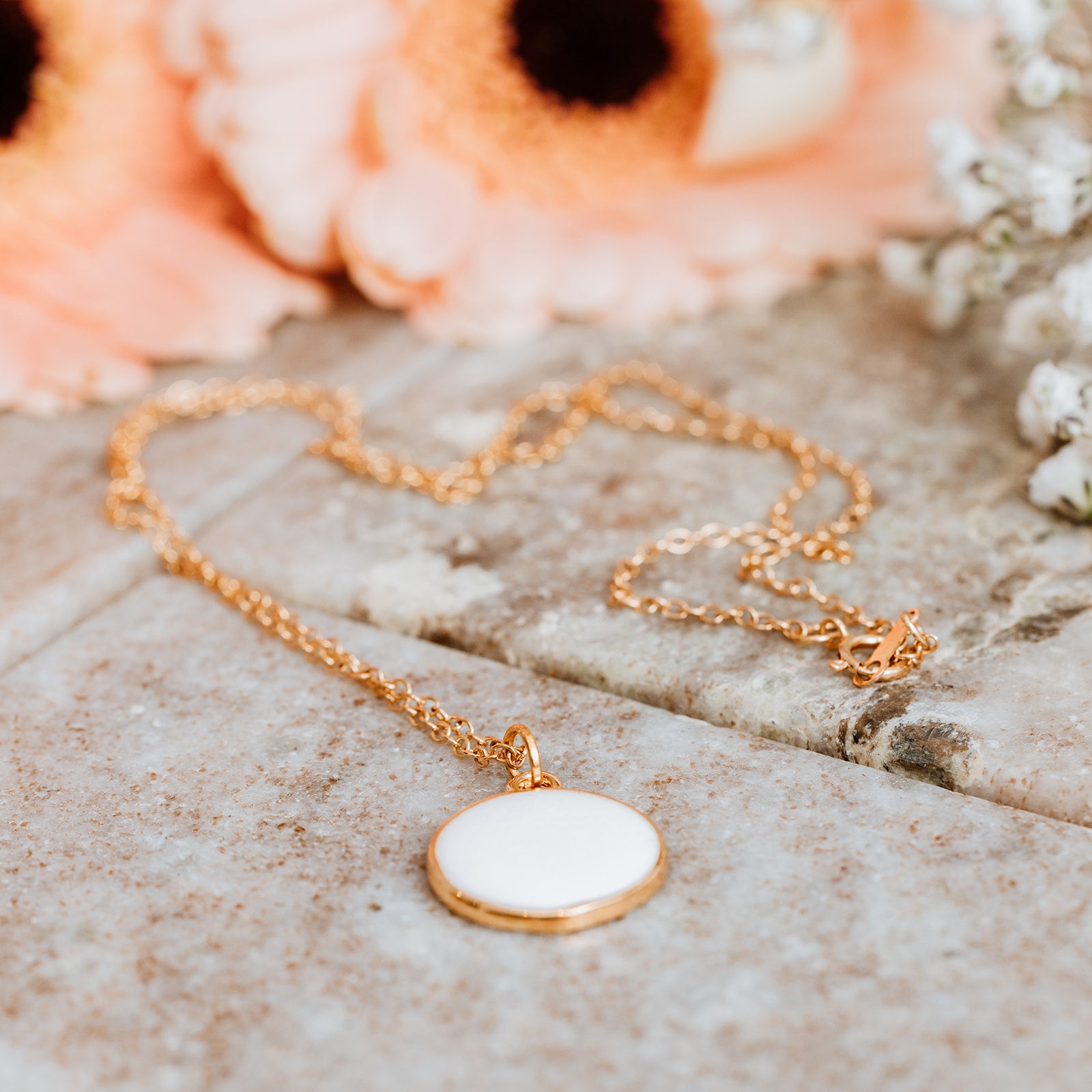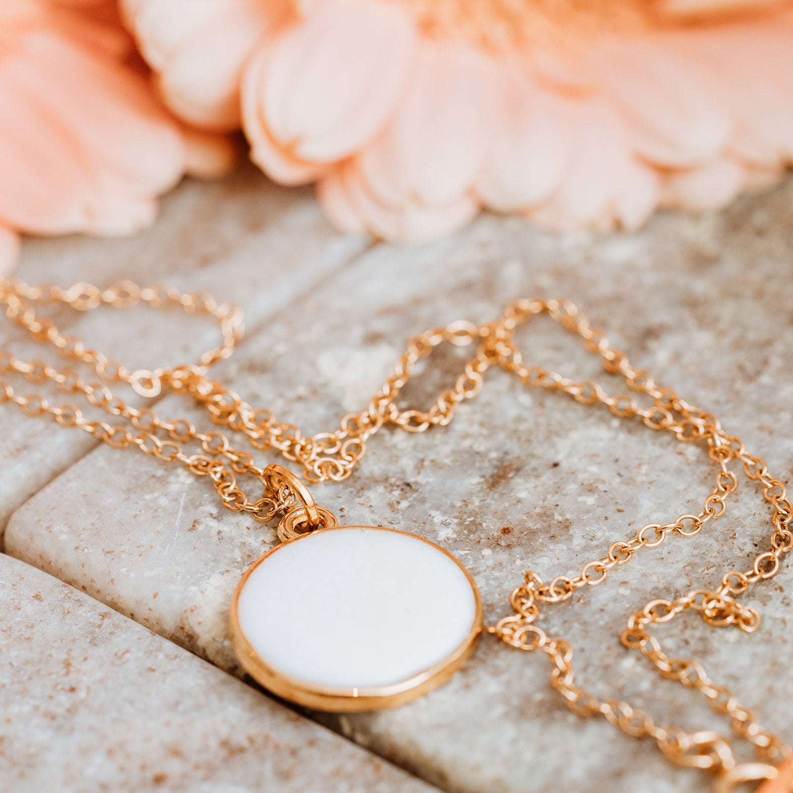 Crisp white enamel, gold trim, and timeless simplicity—modern elegance in one sleek pendant.