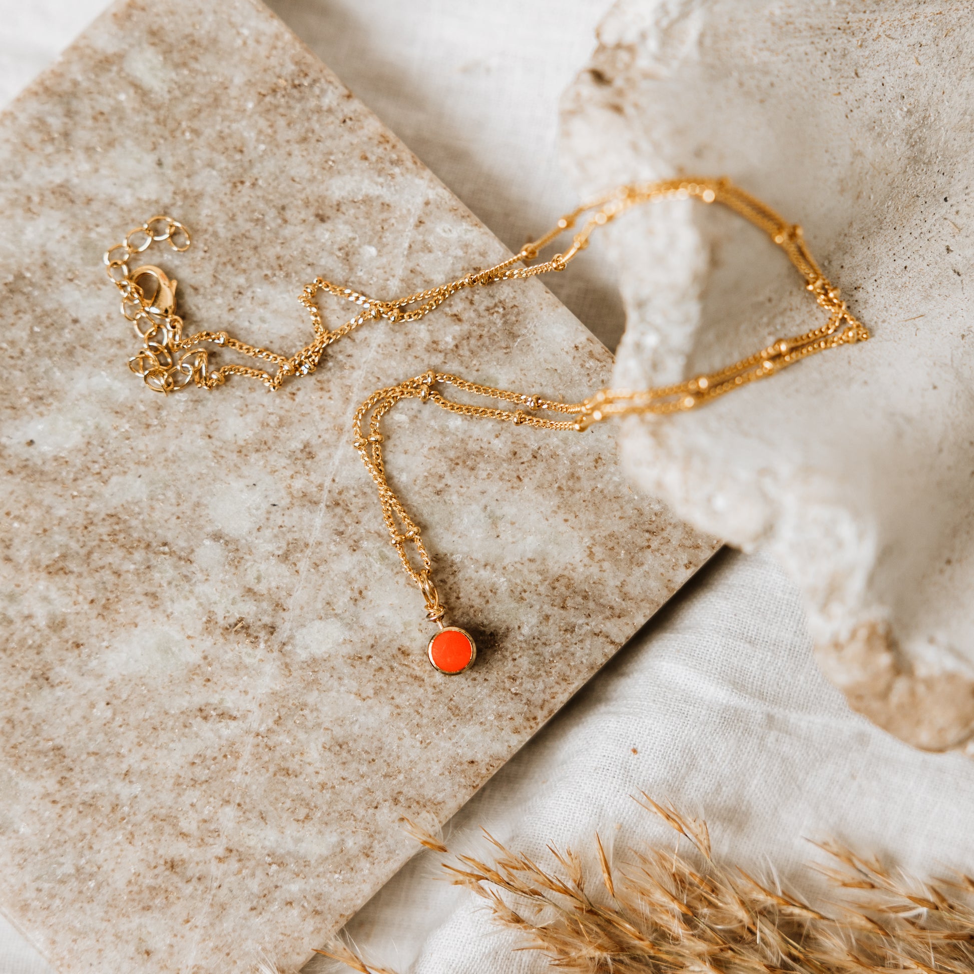 Gold satellite necklace with red enamel dot charm