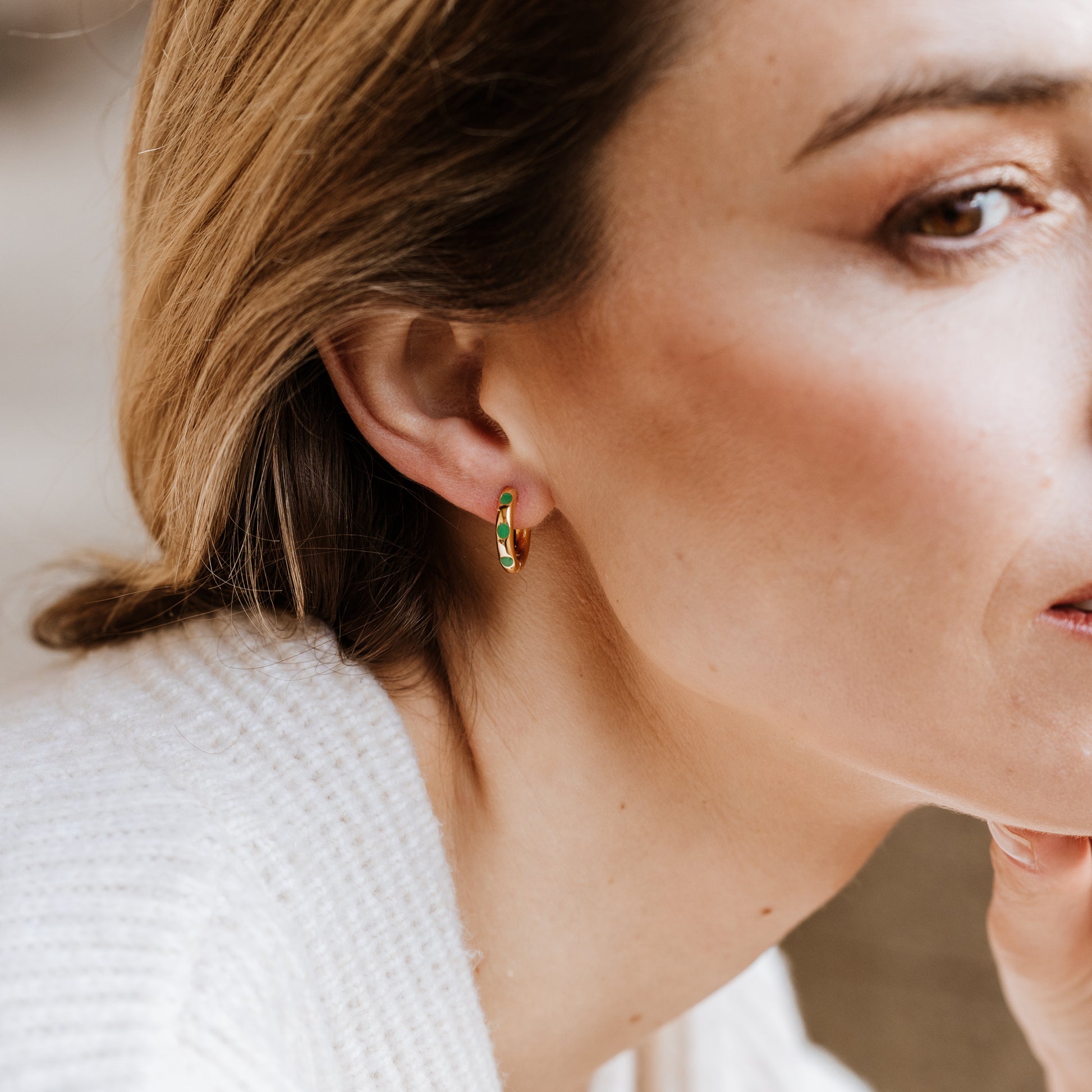 Rich emerald green enamel dots on sleek gold hoops - modern, vibrant and easy to wear